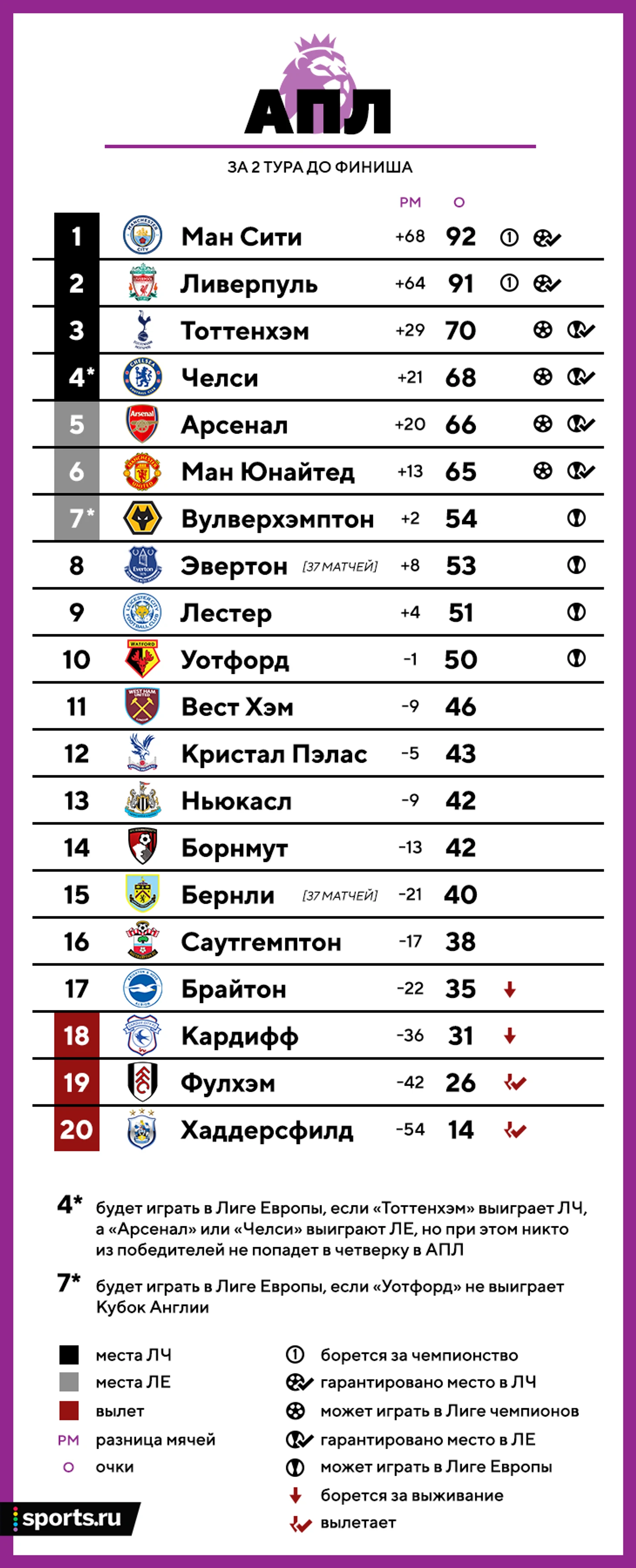 Командам английской премьер-лиги осталось по два матча до финиша. В отличие от почти всех других топ-чемпионатов, в АПЛ еще жива чемпионская интрига. Кроме того, остаются вопросы по попаданию в Лигу чемпионов, Лигу Европы и чемпионшип.
