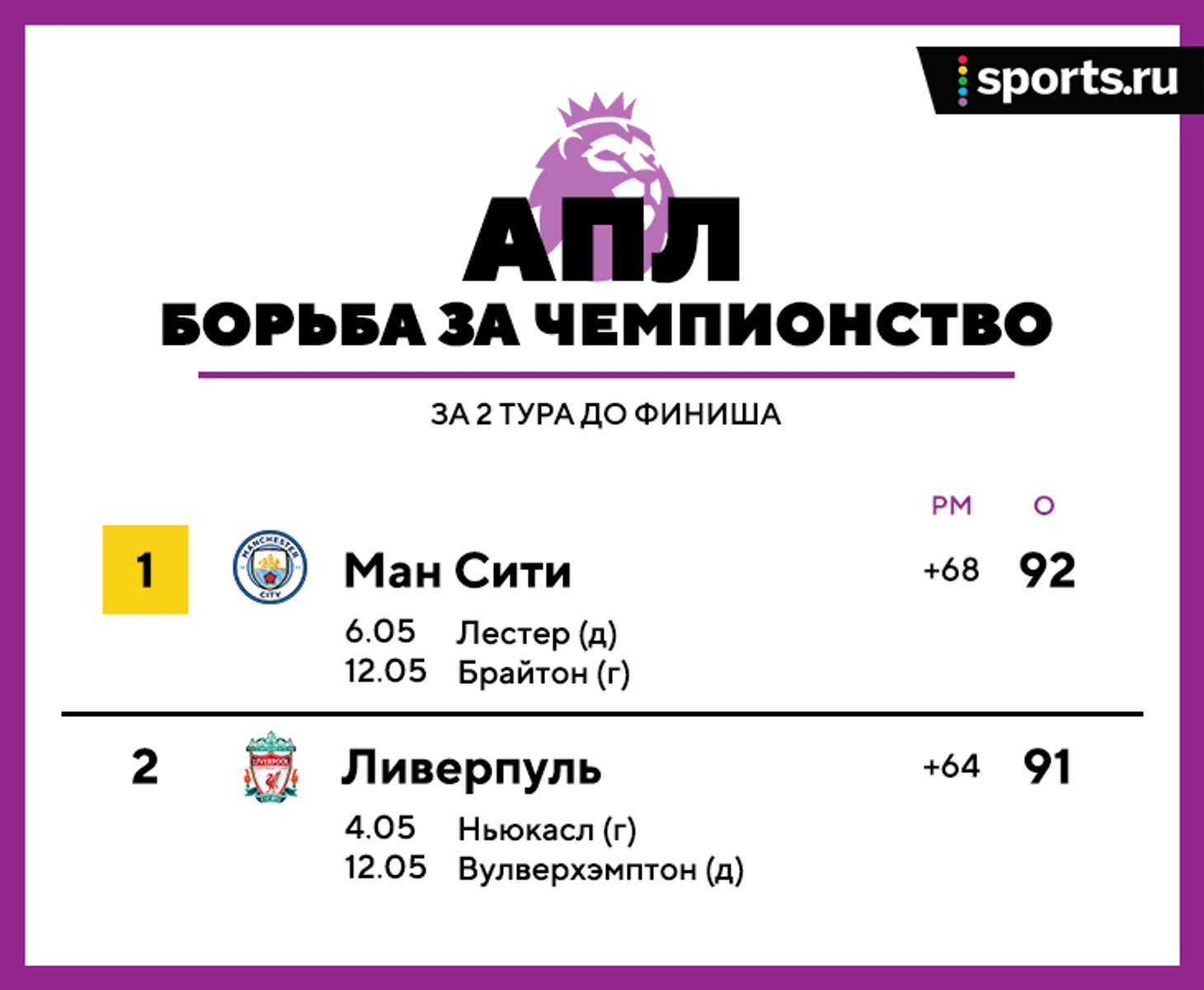 • Кажется, «Лестер» Брендана Роджерса – главный шанс «Ливерпуля» на первое чемпионство в эпоху АПЛ. «Брайтон» в 2019 году вообще редко у кого отбирает очки (2 очка в 7 последних турах) – надежд на него в последнем туре почти нет. Так что если Гвардиола в понедельник обыграет бывшего тренера «Ливерпуля», чемпионство «Ман Сити» почти гарантировано. Впрочем, к тому моменту другой бывший тренер «Ливерпуля» уже может убить интригу – вечером в субботу сам «Ливерпуль» играет с «Ньюкаслом» Рафы Бенитеса.