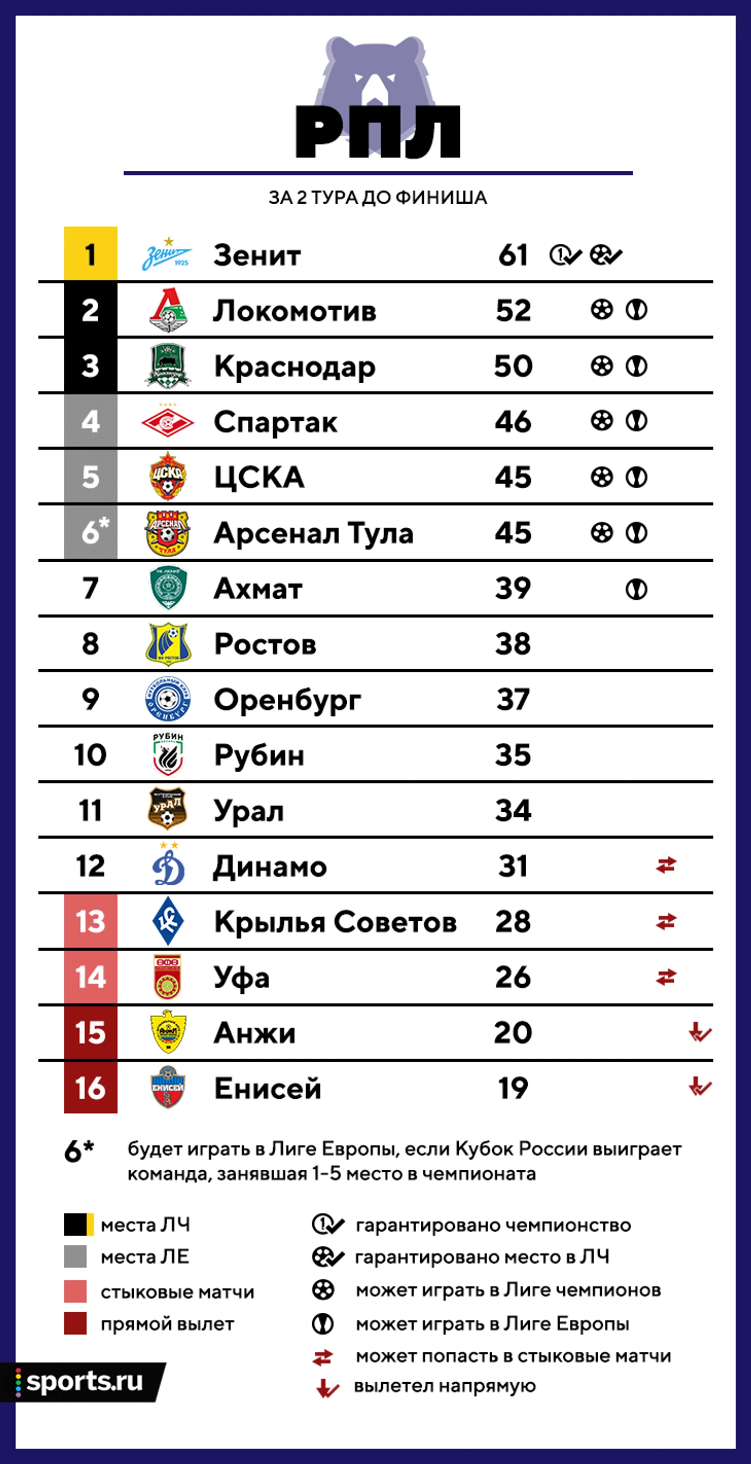 За два тура до финиша ситуация в ключевых зонах таблицы упростилась. «Зенит» – чемпион, «Локомотив» и «Краснодар», вероятнее всего, сыграют в ЛЧ, а «Спартак», ЦСКА и тульский «Арсенал» поборются за два места в Лиге Европы (из борьбы выпал «Ростов»).