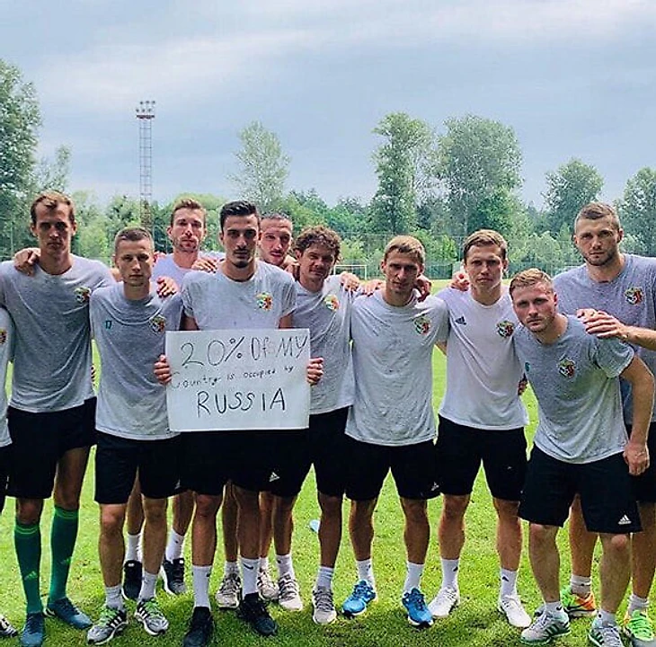 К перфомансу присоединились и на Украине, футболисты «Ворсклы» сфотографировались с плакатом: «20% моей страны оккупированы Россией». Плакат держал грузинский защитник Андро Гиоргадзе.