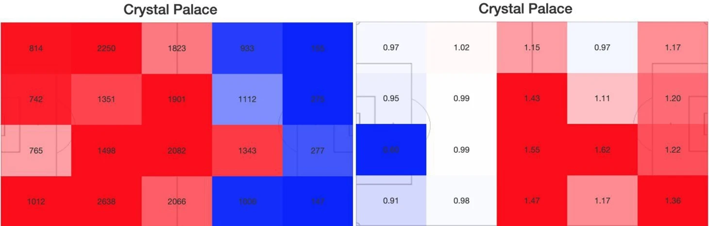 Вторая важная диаграмма – допущенные метры вперед на потерю (относительно среднего по лиге в этой зоне). Видно, что вплоть до своего среднего блока «Кристал Пэлас» позволяет сопернику хорошо продвигаться. Потом в среднем блоке справляются примерно на сопоставимом уровне во всех четырех зонах. И в низком, и в среднем блоке Уан-Биссака надежнее (пусть и несильно) ван Анхольта на тему сдерживания продвижения соперника, но относительно лиги он не выделяется.