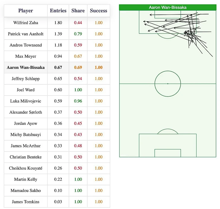 У Уан-Биссаки страдает качество передачи. У него только 0.67 успешных энтри в чужую штрафную за счет передач и кроссов за 90 минут – невыразительно даже по меркам «Кристал Пэласа». При этом он создает всего 0.07 xA с игры. Если посмотреть на его активность – передачи и раны – в зонах 1-2, то это будет объем всего лишь 5.4 за 90 минут – опять же невыразительно даже на фоне «Кристал Пэласа», где его сильно бьет даже Ван Анхольт. При этом в развитии в ключевых зонах 6-7 у него лишь 13.2 метра вперед на потерю при точности передач в этих зонах всего 57%.