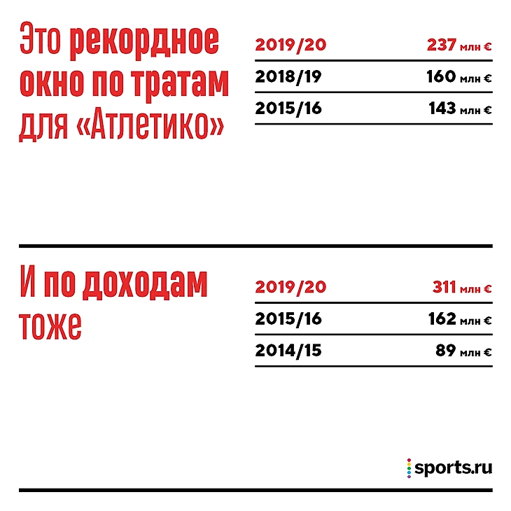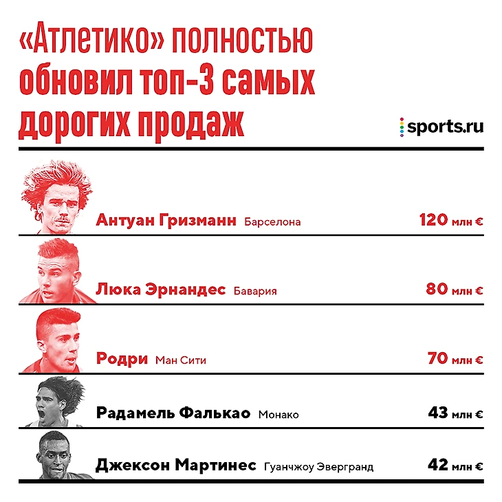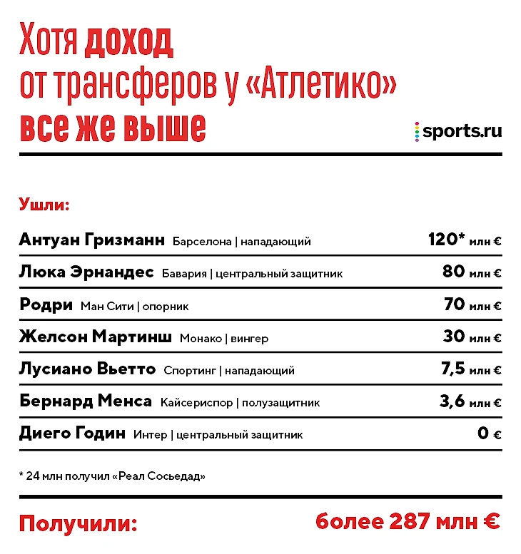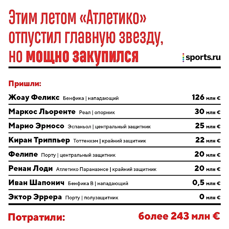 Мы опубликовали этот материал в июле. С того момента цифры не изменились, но важно уточнить: «Атлетико» еще бесплатно (во всяком случае информации про деньги нет) подписал Николаса Ибаньеса и свободно отпустил Хуанфрана, Эктора Эрнандеса, Филипе Луиса и Андре Морейру.