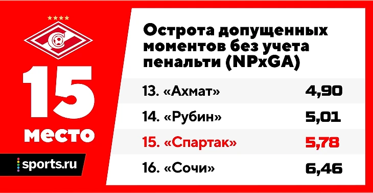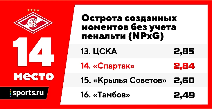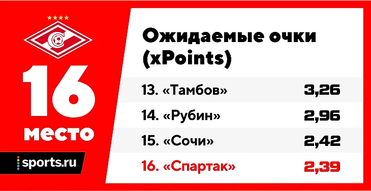 «Спартак» на последнем месте по ожидаемым очкам. Этот показатель считается на основании совокупной остроты созданных и допущенных моментов. Если нужно трансформировать понятие «качество игры» в цифры, обычно берут именно эту цифру: