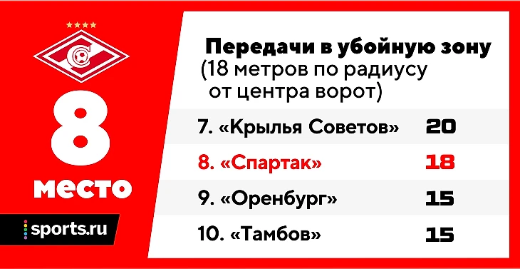 «Спартак» банально недостаточно часто доставляет мяч в опасные зоны. По точным пасам в убойную зону внутри штрафной они уступают всем топам.