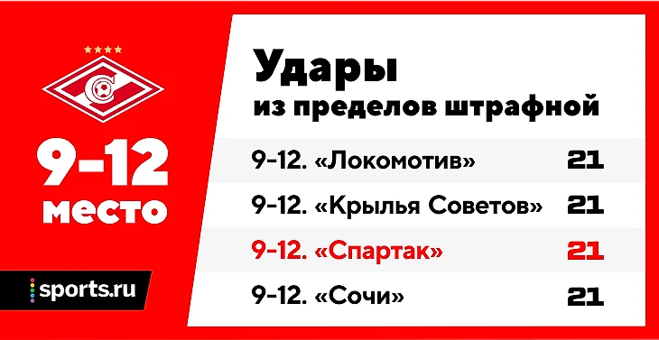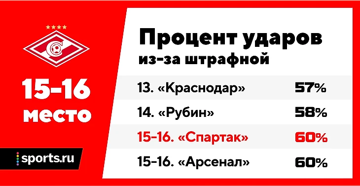 Ни разу «Спартак» не нанес за матч больше 3 ударов из штрафной с игры. Даже с учетом сильных стандартов команда Олега Кононова проседает по этому показателю.