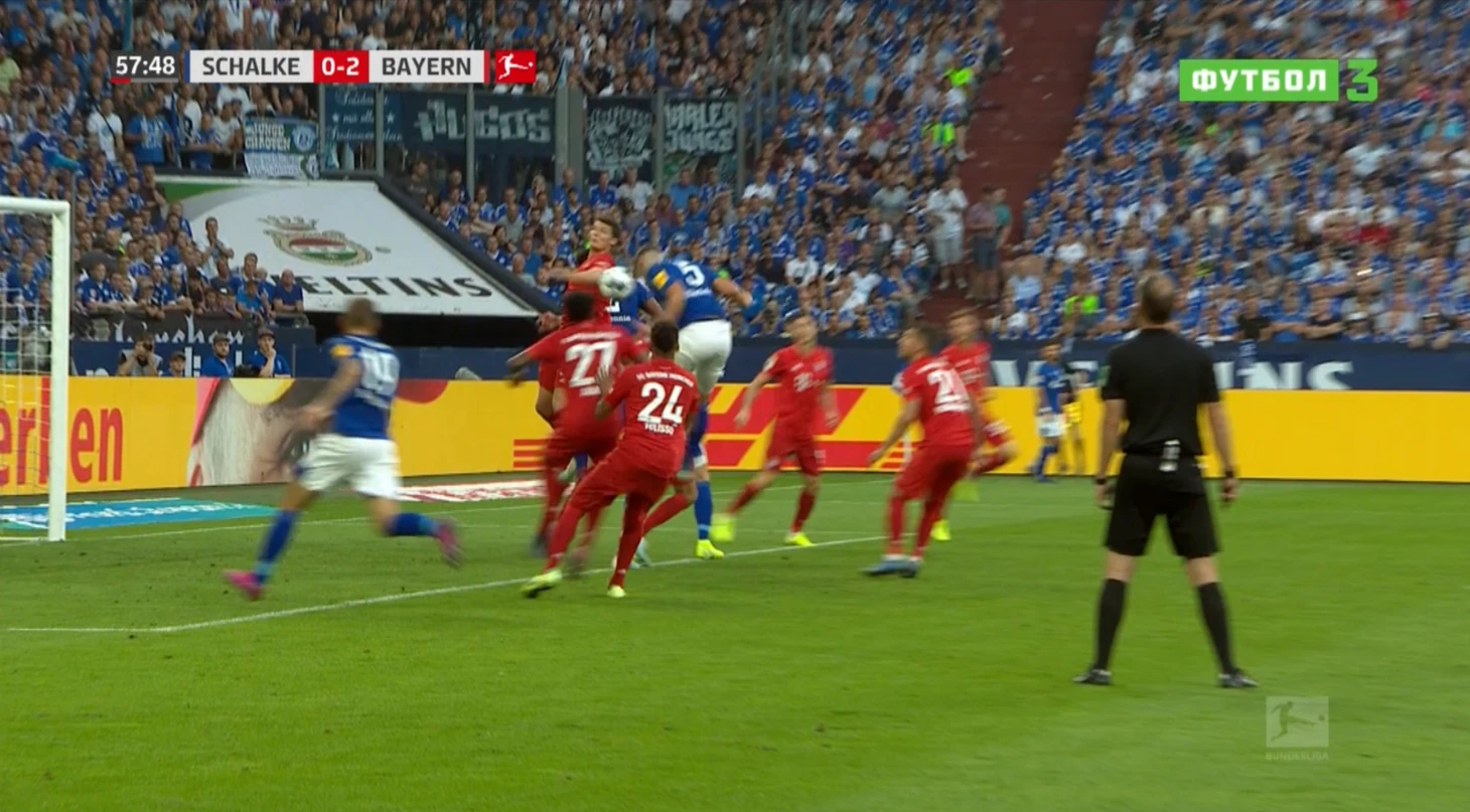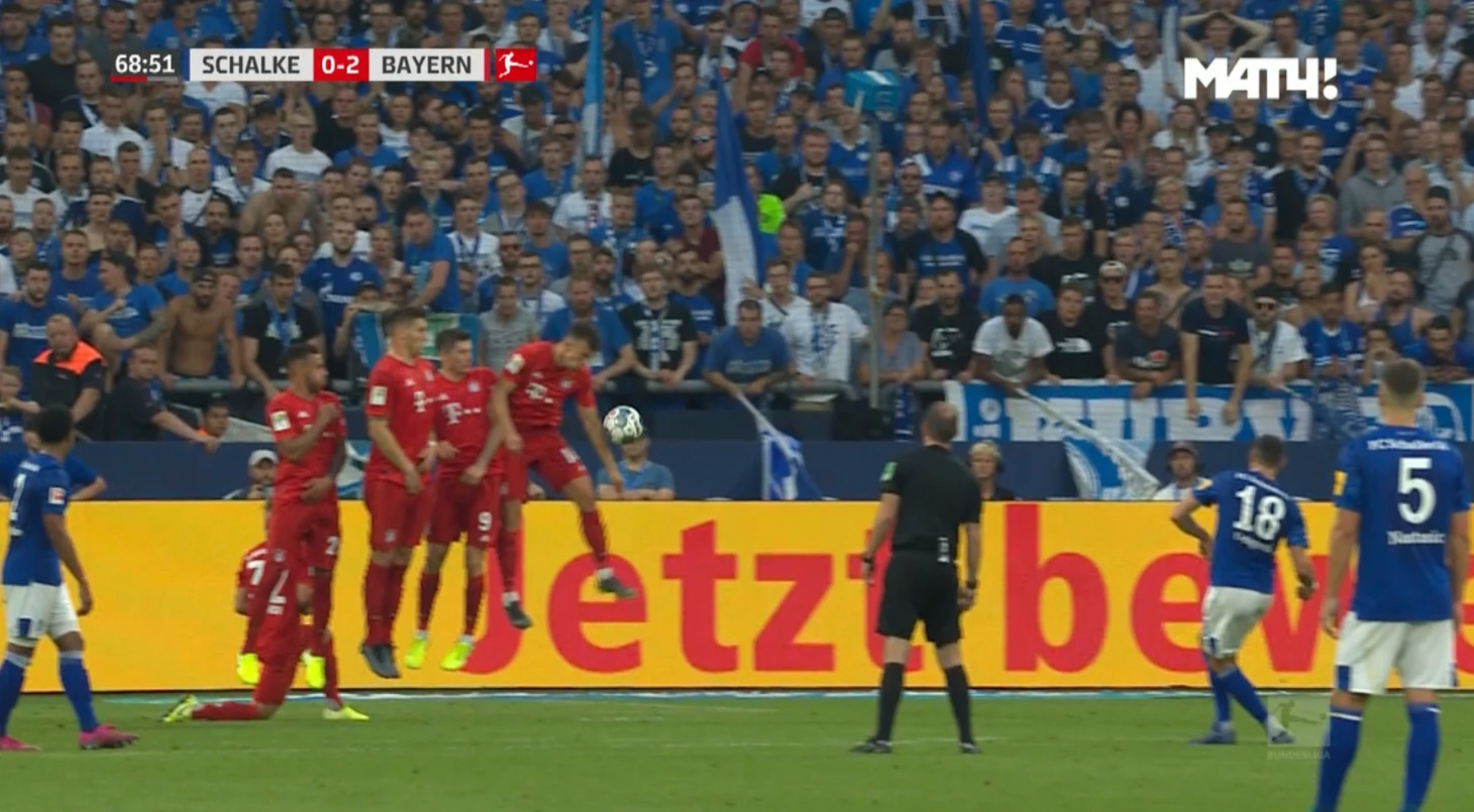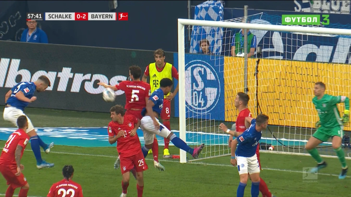 Через 7 минут «Шальке» пробивал опасный штрафной вблизи ворот «Баварии» – плотный удар Даниэля Калиджури встретила рука подпрыгнувшего Ивана Перишича, который был крайним в стенке.