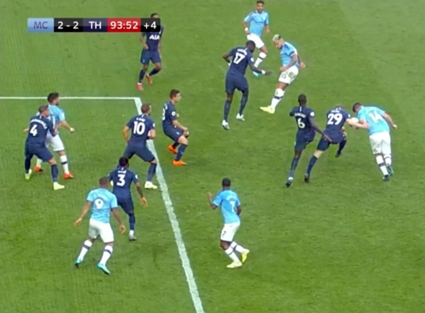 Снова Сити-Тоттенхэм. Мяч залетает в ворота Тоттенхэма, попав нападающему случайно в руку.