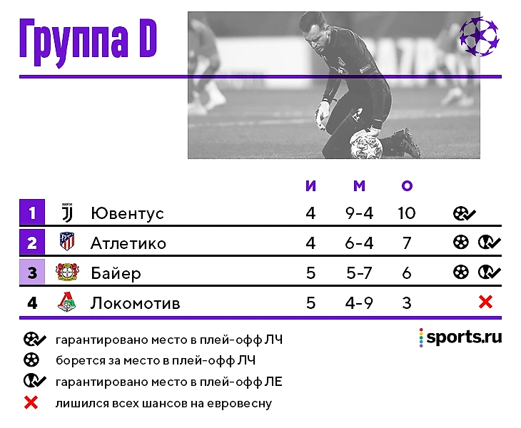 Даже если «Байер» дома проиграет «Юве», а «Локо» в гостях обыграет «Атлетико», это не поможет. Немцы лучше по личным встречам – «Локо» победил в Леверкузене 2:1, «Байер» в Москве – 2:0.