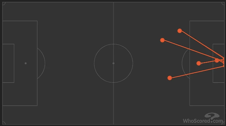 70-я минута. «Зенит» не бросается все исправить. Карта ударов в створ к этому моменту выглядит так. Слева удары «Зенита», справа – «Бенфики».