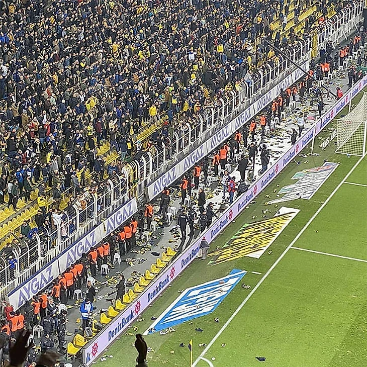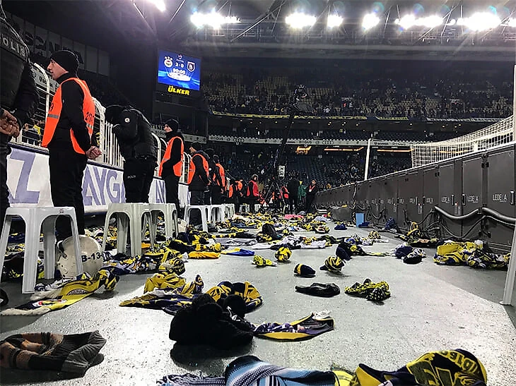 В добавленное время матча субботнего матча чемпионата Турции между «Фенербахче» и «Истанбулом» при счете 2:0 на поле с трибун арены «Шюкрю Сараджоглу» полетели шарфы, шапки и другие теплые вещи.