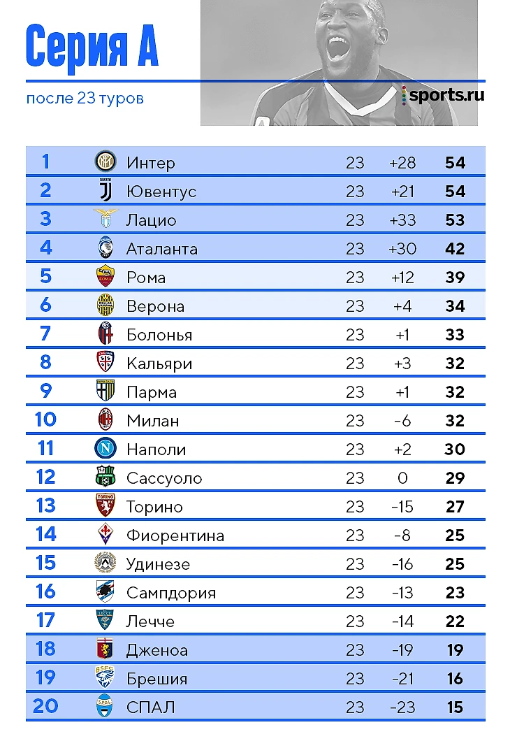 • Три лидера после 23 туров серии А! «Интер» формально первый, потому что лучше разница мячей (+28 против +21 у «Юве»). Но главный критерии при равенстве очков в серии А – личные встречи. Пока топы провели только один матч – «Юве» победил в Милане 2:1. Возможно, чемпионская гонка решится в ответном – 1 марта в Турине.