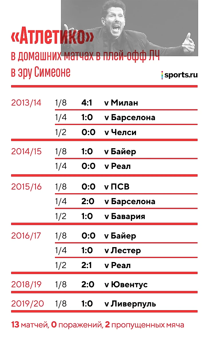 При Чоло «Атлетико» никогда не проигрывал дома в плей-офф ЛЧ и пропустил всего 2 мяча! В 13 матчах – 9 побед и 4 нулевых ничьих.