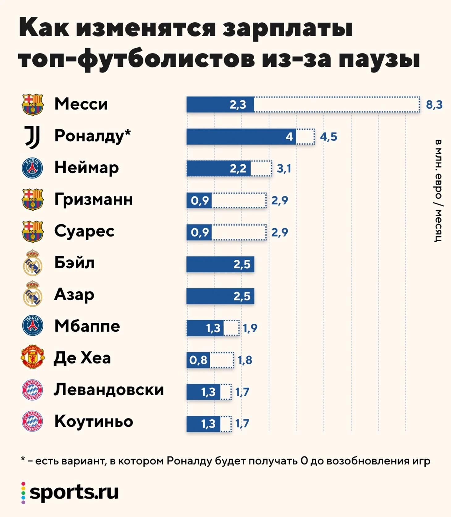 Франция. В среднем клубы Лиги 1 снижают зарплаты всем сотрудникам в два раза. Даже «ПСЖ» переводит всех в клубе на частичную или технологическую безработицу. Это позволит парижанам платить только 70% зарплаты, получая при этом от государства небольшую компенсацию.