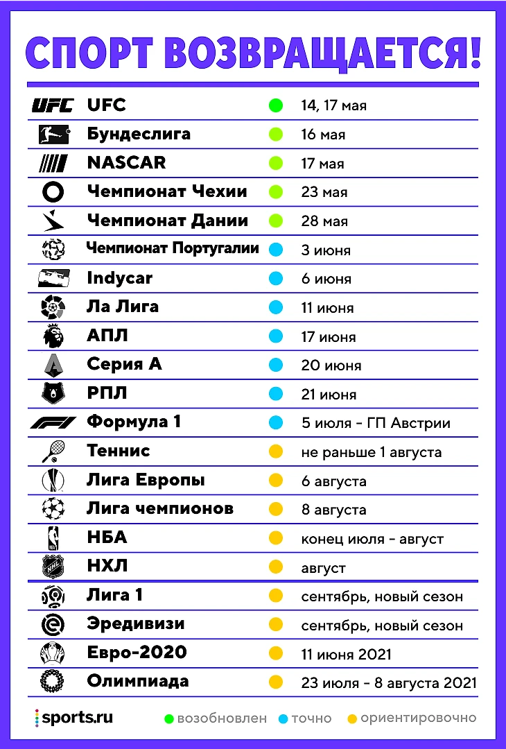 Спорт возвращается все активнее: в Бундеслиге уже играют, АПЛ, РПЛ и Серия А определили даты рестарта, НХЛ утвердила схему