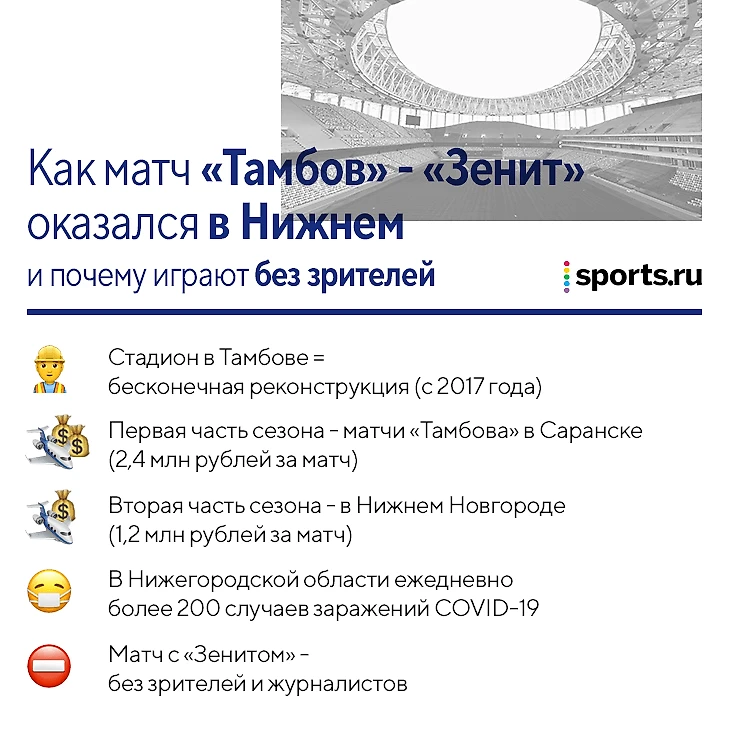 «В целях соблюдения рекомендаций Роспотребнадзора в период нестабильной эпидемиологической обстановки, вызванной пандемией коронавирусной инфекции, правительством Нижегородской области принято решение провести матч 25-го тура Тинькофф РПЛ «Тамбов» — «Зенит» без зрителей, — говорилось в сообщении клуба.