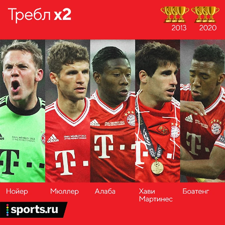 • В «Баварии» пятеро игроков, взявших два требла: это вратарь Мануэль Нойер, защитники Давид Алаба и Джером Боатенг, хавбек Хави Мартинес и нападающий Томас Мюллер.