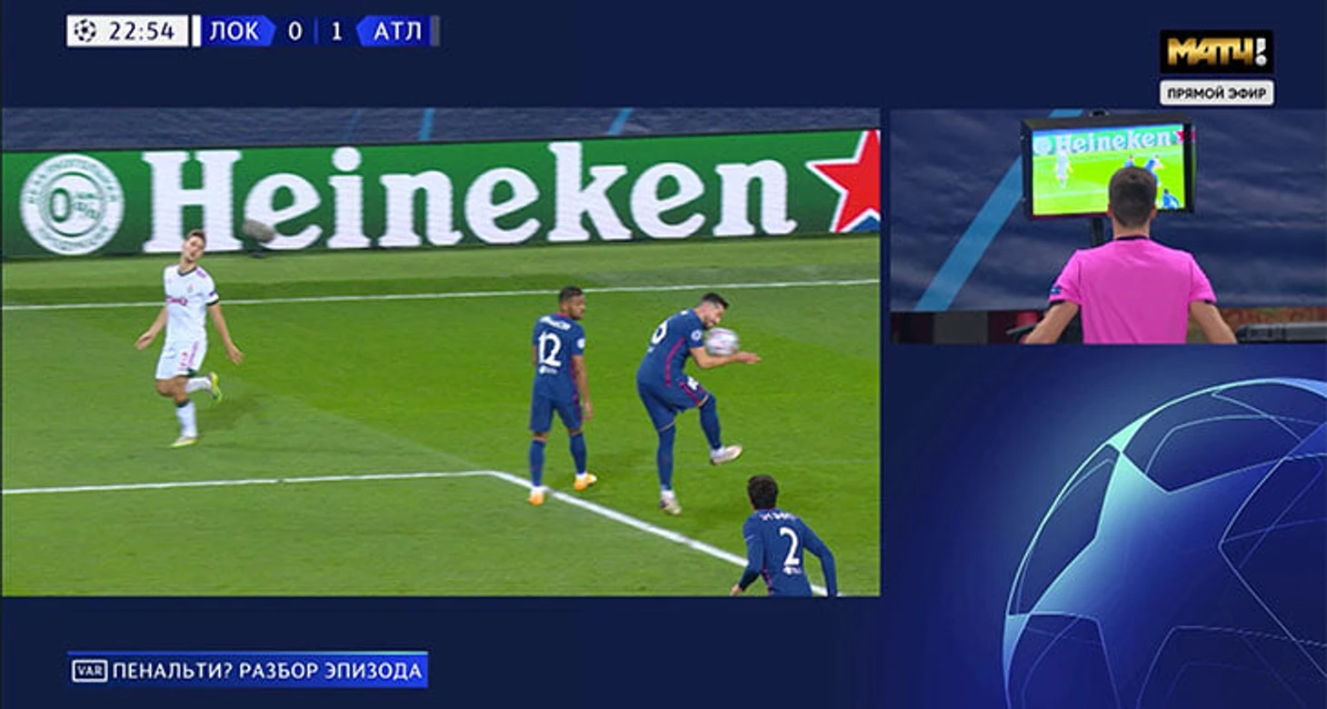 Комментатор Михаил Моссаковский рассуждал, что дело в трактовке: если футболист пытается сыграть в мяч, но тот рикошетит в руку – пенальти нет, если нет попытки действовать чисто – нужно поставить. Поправим его – дело не в намерениях Эрреры (коллега Константин Генич во втором тайме сам на это указал: «Неправильный вывод сделал»).