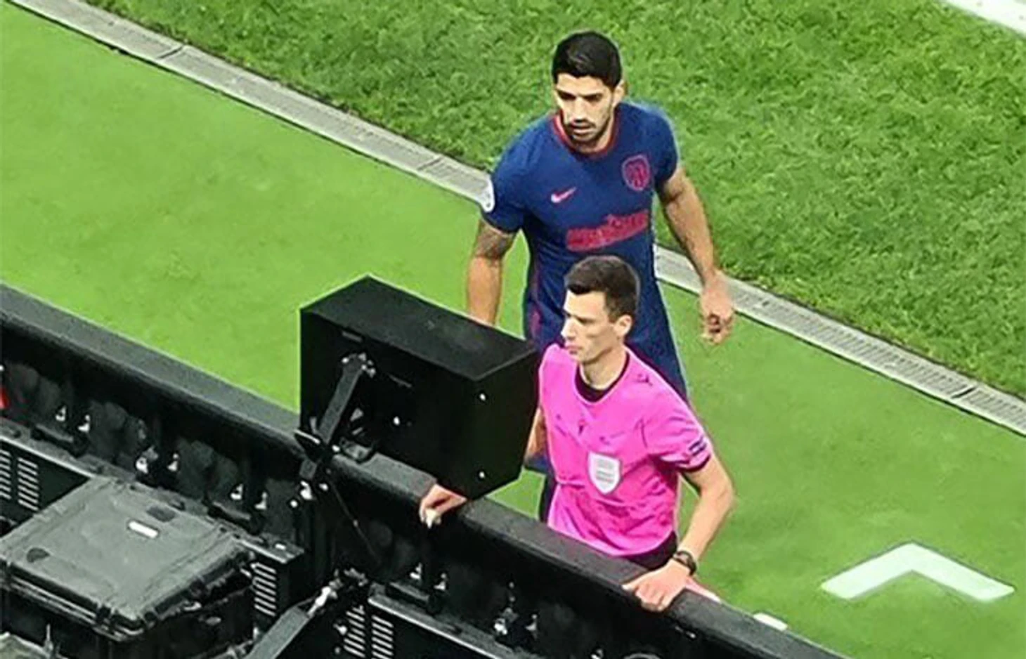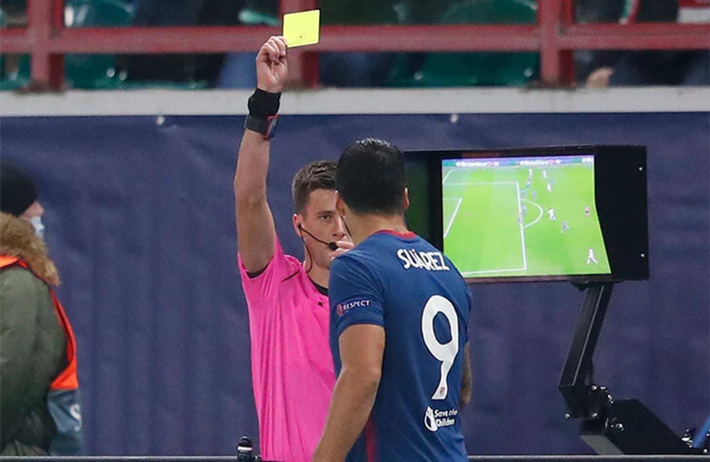 «Атлетико» понесся в контратаку, Луис Суарес готовился умчаться вперед, но его срубили. Судья Бенуа Бастьен поставил штрафной, Суарес требовал желтой, но француз вместо этого стал слушать ВАР. А затем сам отправился к экрану.