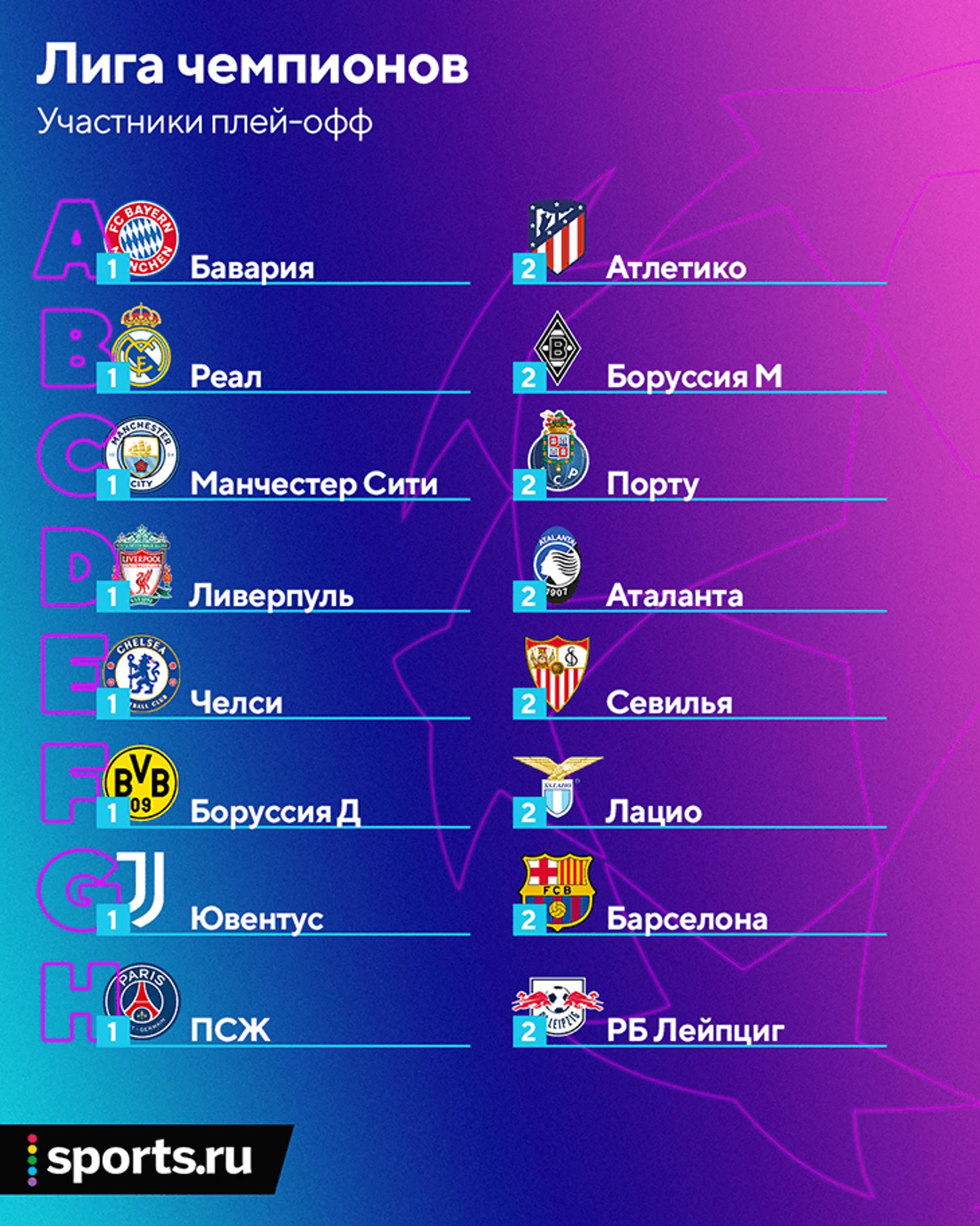 • Все четыре команды из Германии: «Бавария» и «Боруссия» Д выиграли группы, «Лейпциг» и «Гладбах» вышли со вторых мест.