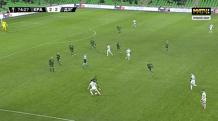 Нападающий Бруно Петкович противостоял Вандерсону на фланге, но это не особо тревожило. «Краснодар» сгруппировался, выстроив в оборонительной линии пять человек.