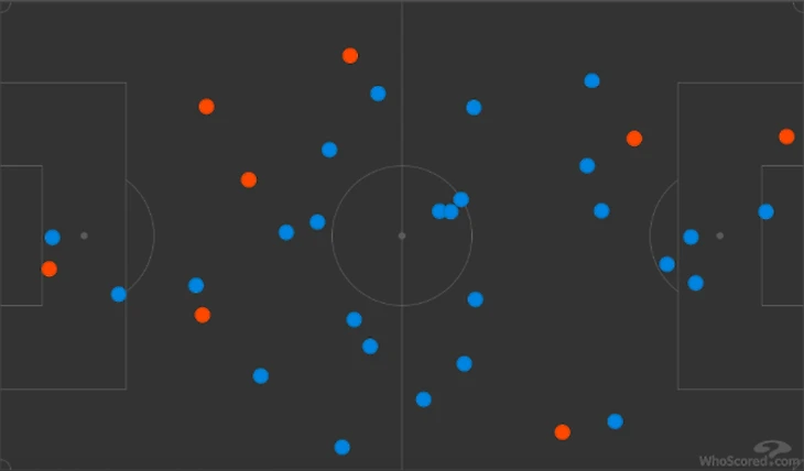 Еще более показательный момент – верховые единоборства. Синие – те, что взял «Загреб», оранжевые – «Краснодар». Слева – ворота «Краснодара». Всего 5 выигранных единоборств на своей половине поля.