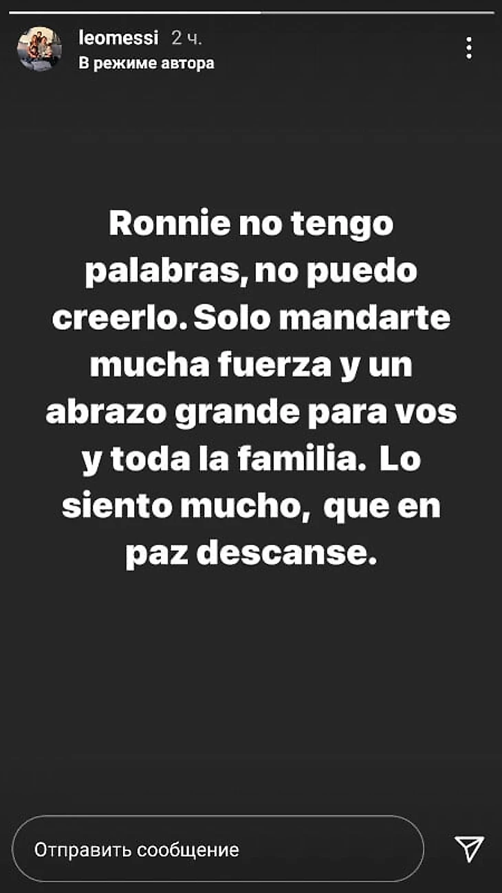 «Ронни, у меня нет слов, я не могу поверить. Желаю тебе много сил, обнимаю тебя и всю твою семью. Я очень сожалею, пусть она покоится с миром», – написал Месси в инстаграме.