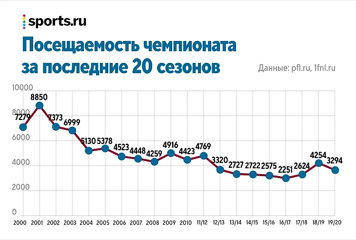 А действительно ли проблема только в ФНЛ? В РПЛ такой жестко отрицательной динамики нет – там худший показатель (10412 человек на матч) пришелся на сезон-2014/15, то есть за два года до низшей точки первой лиги. И какой-то значительной динамики на понижение нет – совпадение только в росте после открытия стадионов к ЧМ.
