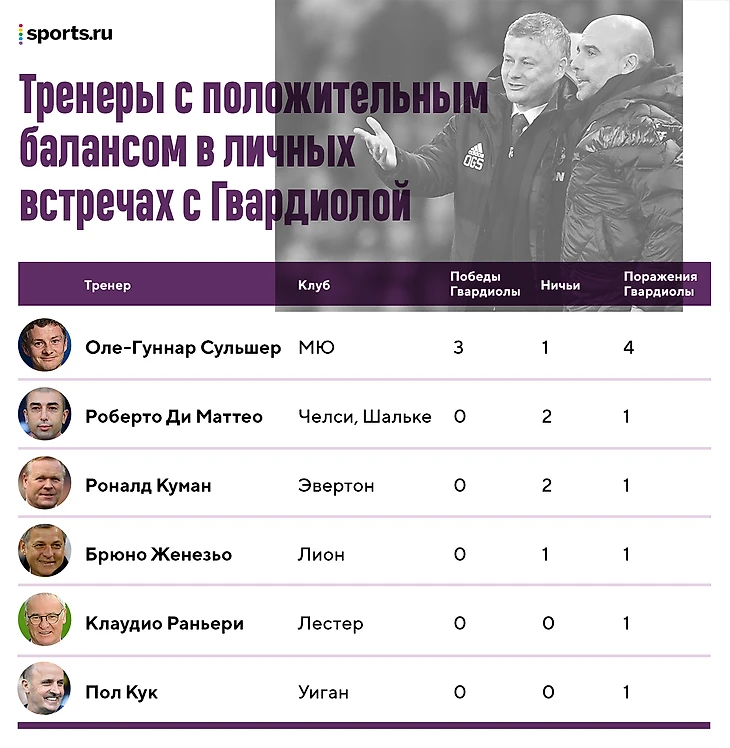 В мире только 6 тренеров с положительным балансом против Пепа. Лидер рейтинга – Сульшер