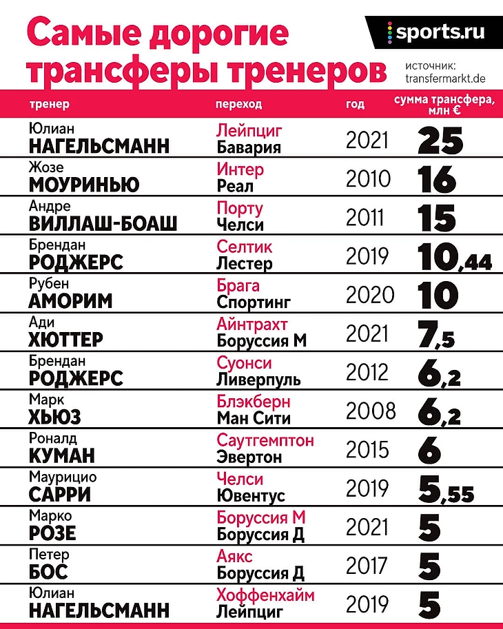 Это самый дорогой трансфер тренера в истории, но далеко не первый случай, когда за тренеров платят большие деньги: в Бундеслиге это частая практика (Нагельсманн – третий трансфер тренера в 2021-м), а «Сити» платил «Блэкберну» за Марка Хьюза еще в 2008-м.