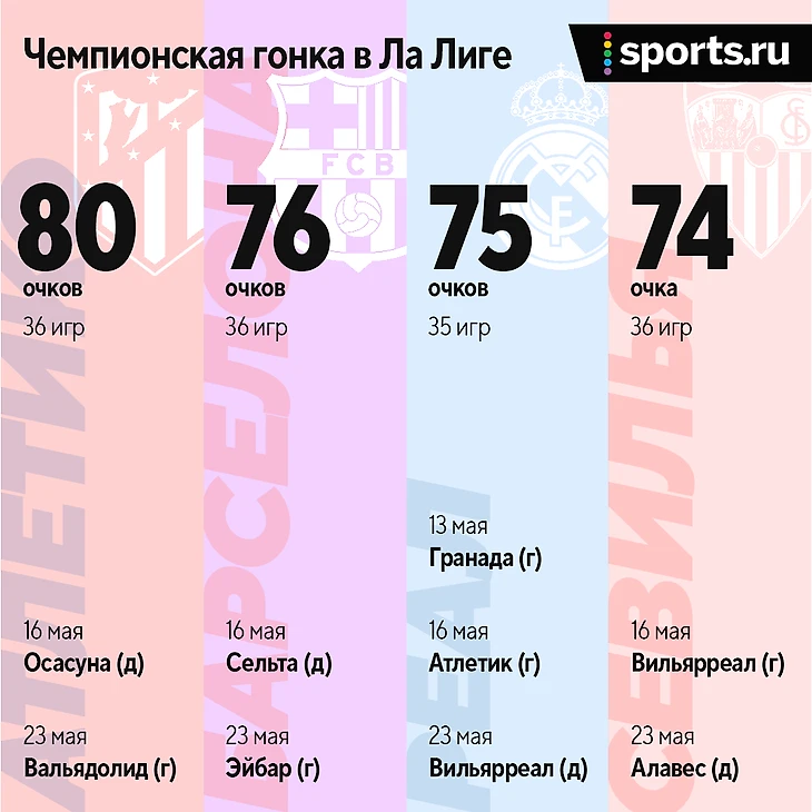 «Атлетико» воспользовался дурацким провалом «Барселоны» и ушел обратно на безопасное расстояние от каталонцев – теперь между ними четыре очка. «Реал» сыграет свой матч 36-го тура с «Гранадой» в четверг – у «Мадрида» шанс остаться в двух от лидера, пока по набранным отстают на пять.