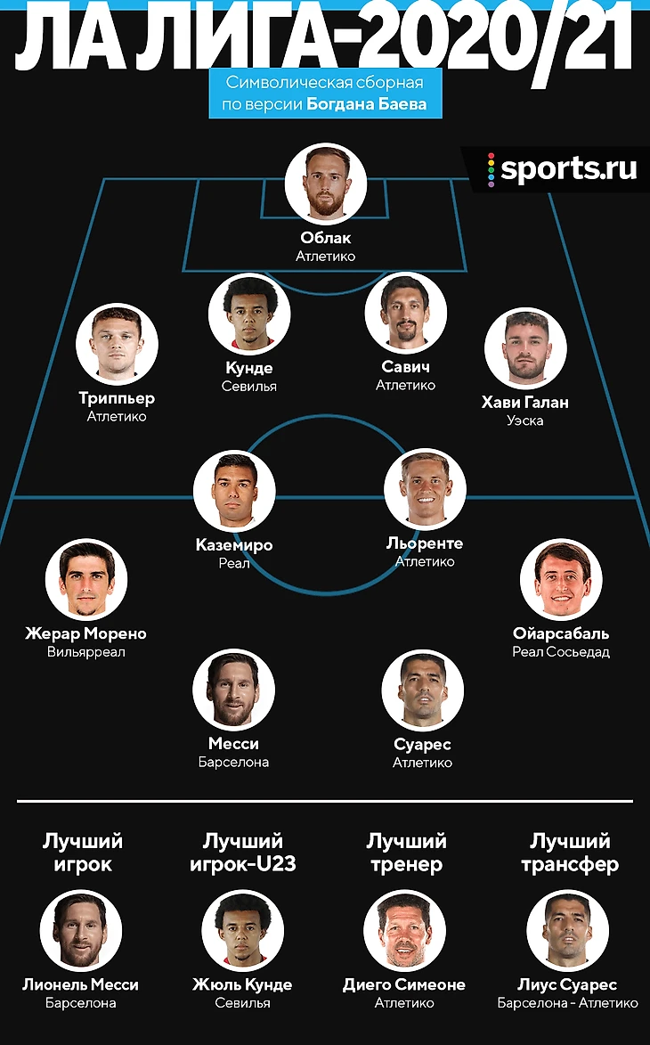 Облак, Льоренте и Суарес – от чемпионского «Атлетико». Каждый блистал в своем деле. Ян – спасения на ленточке, Маркос – умные рывки и игра на разных позициях, Суарес – завершение атак.