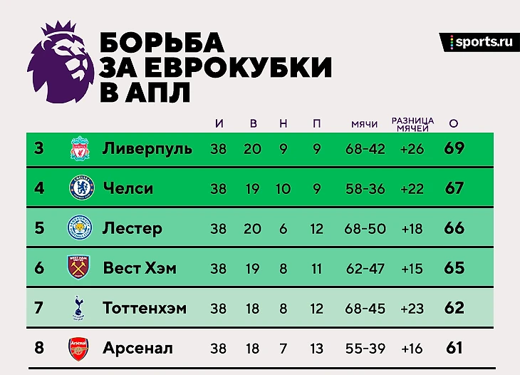 • «Арсеналу» не досталось даже такого: претендовали на евроместо до последних минут, но победный гол Бэйла в Лестере оставил их только восьмыми, собственная победа над «Брайтоном» не помогла.