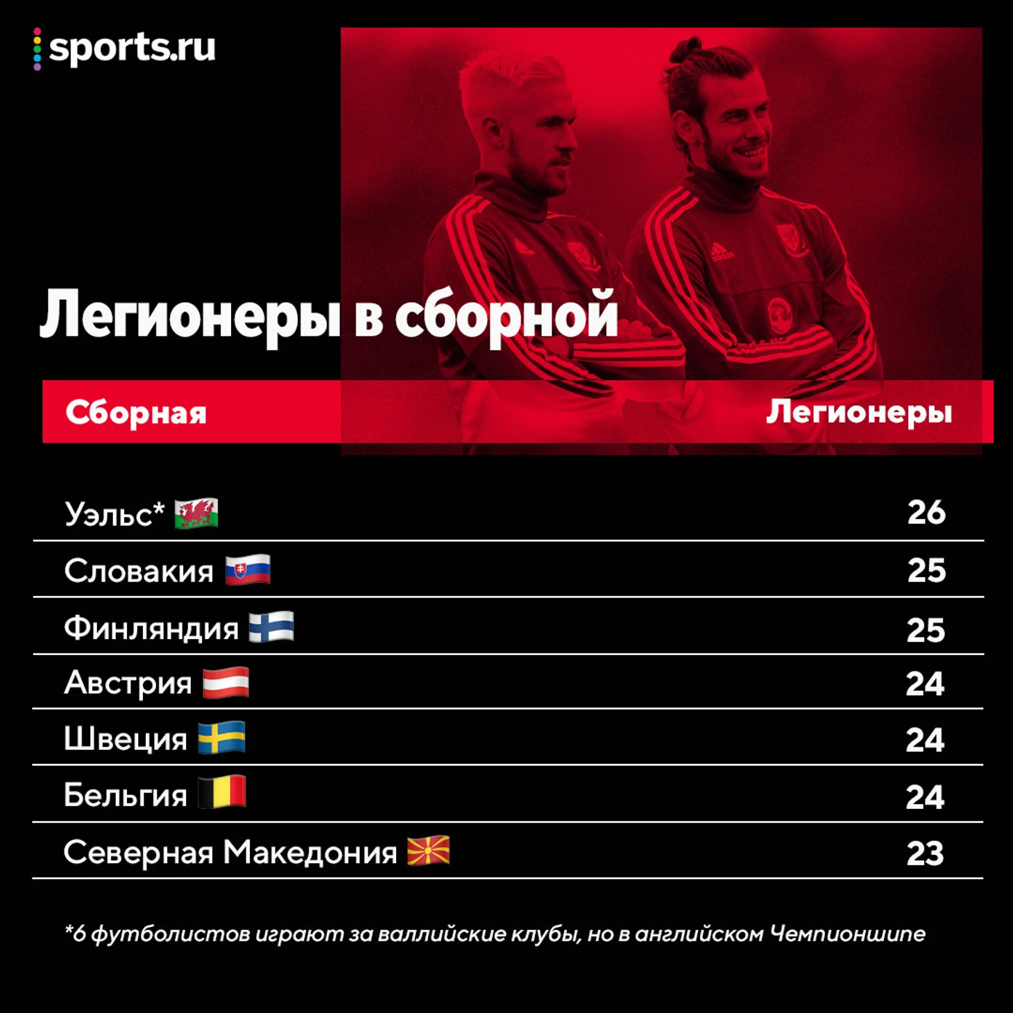 • Валлийцы играют в Чемпионшипе, АПЛ и даже английской Первой лиге – за пределы острова выбрался только Аарон Рэмзи («Ювентус»).