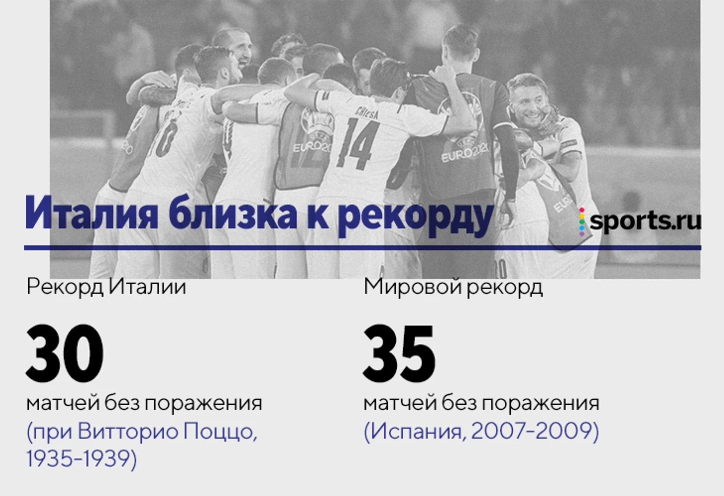 • Италия близка к тому, чтобы побить национальный рекорд – пока держится достижение в 30 матчей, так долго итальянцы не проигрывали в 1930-е, серия оборвалась в 39-м. Осталось две игры в группе и первый раунд плей-офф. Мировой рекорд подальше, его на Евро побить не успеют: это 35 игр сборной Испании с 2007-го по 2009-й. У Италии с финалом тут может быть максимум 34, придется ждать осени.