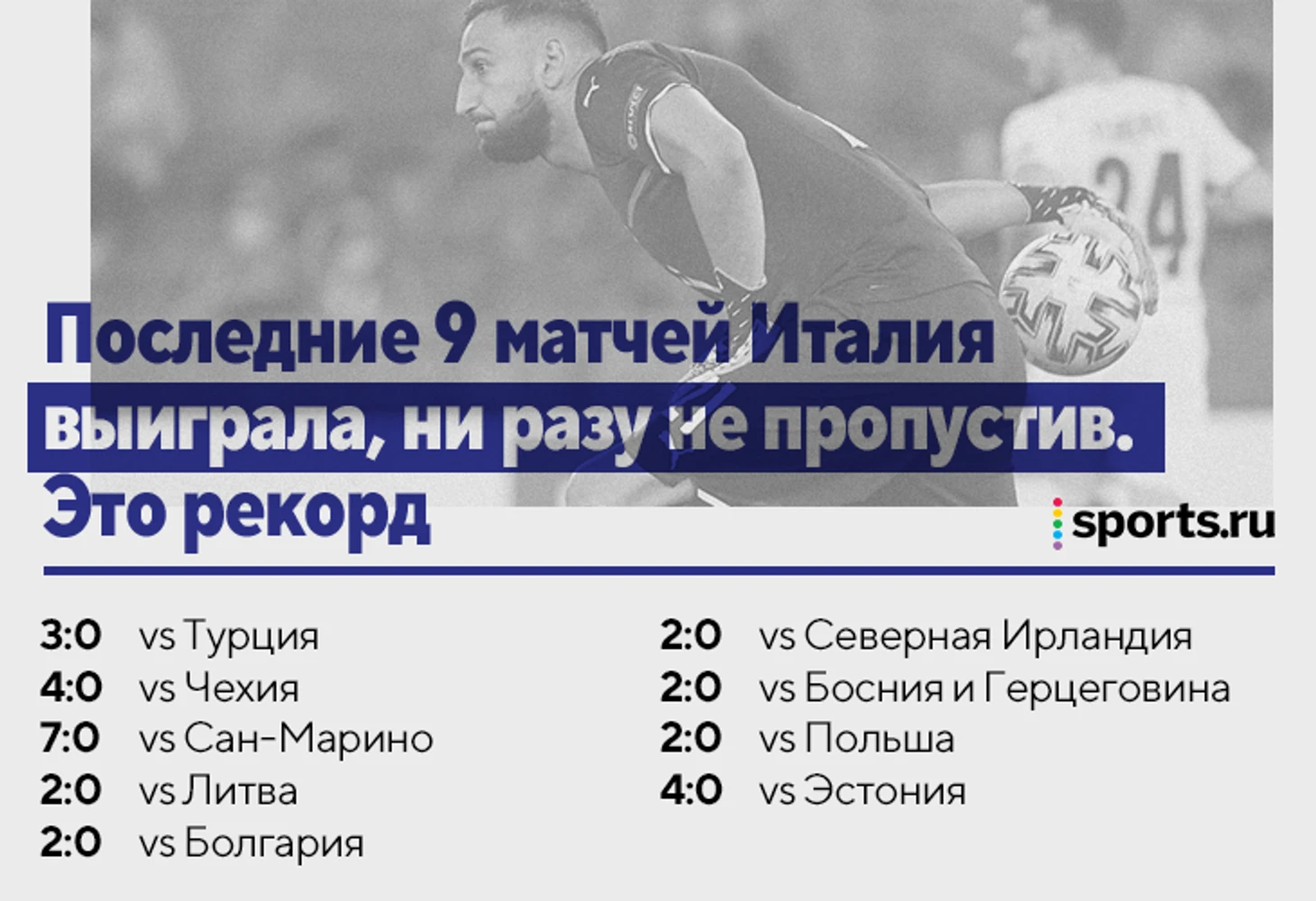 • По ходу этой серии у Италии 23 победы и пять ничьих, разница мячей – космические 77:7. Сейчас была девятая победа подряд после двух ничьих, но когда серия только разгонялась, был отрезок и еще мощнее: 11 выигранных матчей.