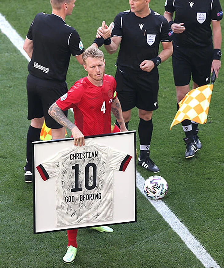 Один из героев спасения Эриксена капитан датчан Симон Кьер получил памятную футболку с автографами: