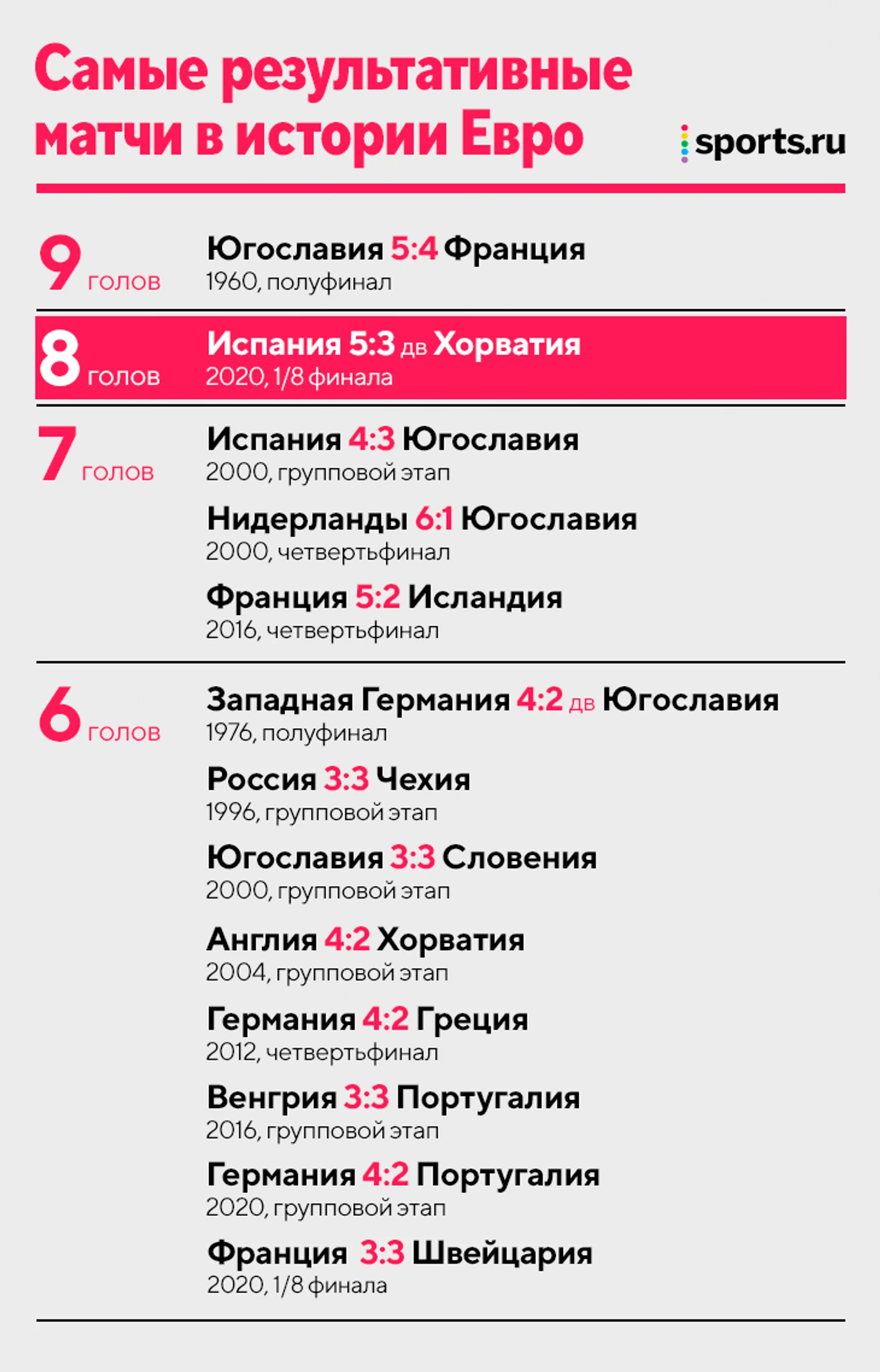 Сразу два вчерашних матча залетели в топ самых результативных матчей Евро. Сначала Испания и Хорватия выдали дичайший спектакль, забив на двоих восемь – второй результат в истории Евро и первый за 60 лет. А затем Франция и Швейцария оформили шесть и тоже вошли в историю.