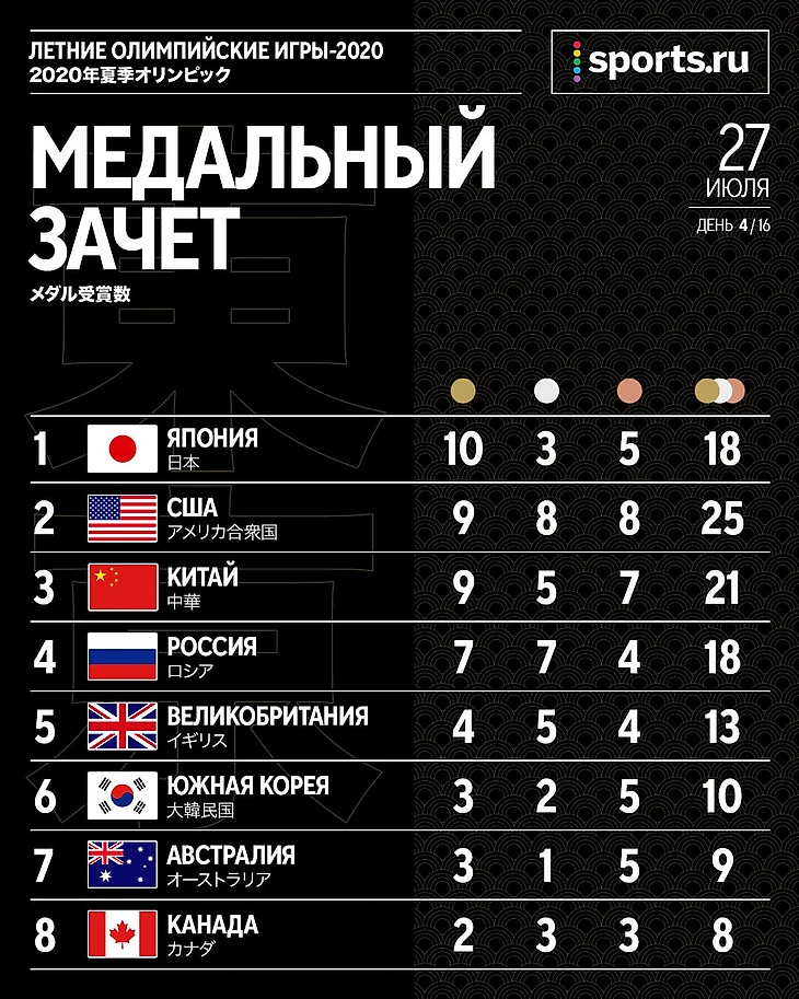 Медальный зачет Олимпийских игр-2020: у России три золота за день (традиция!), Япония удерживает лидерство