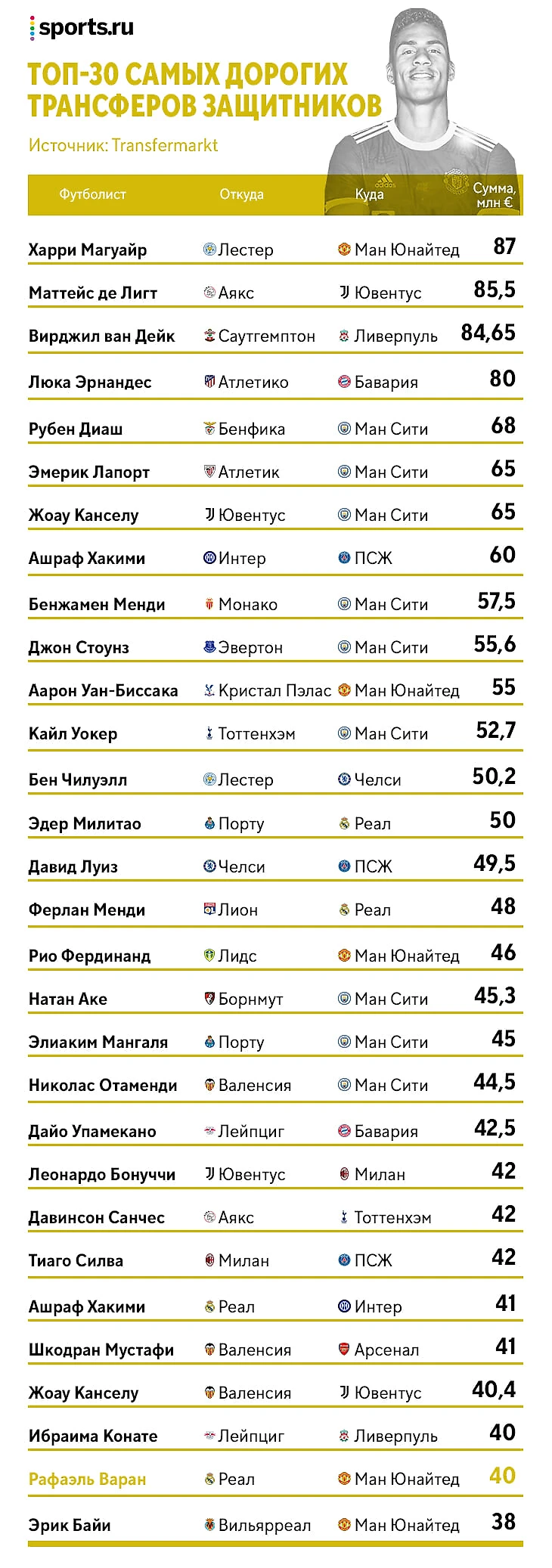 Стоимость Варана по оценке Transfermarkt – 70 млн евро. Но переход в «МЮ» с трудом вошел в топ-30 самых дорогих трансферов защитников в истории.