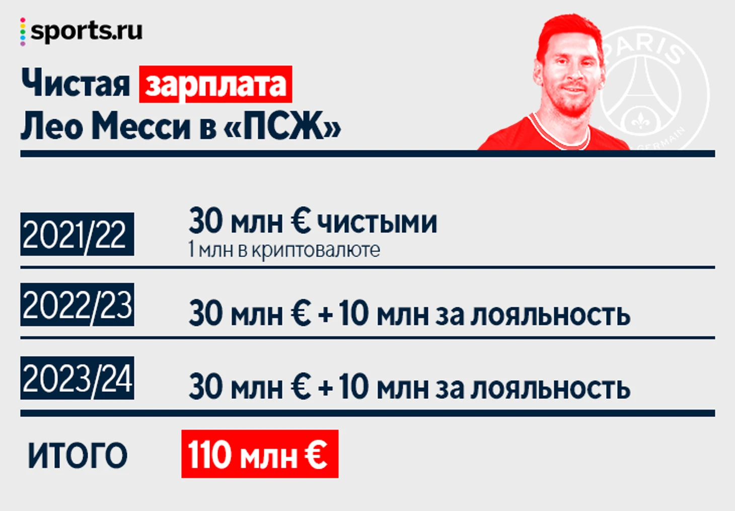 • Фиксированная зарплата Месси в год – 30 млн евро. Неймар получает ту же сумму, Килиан Мбаппе – 12 млн (станет гораздо больше, если переподпишет контракт). За сезон-2021/22 Лео получит один млн евро в криптовалюте.