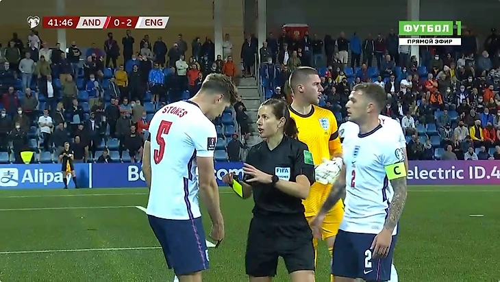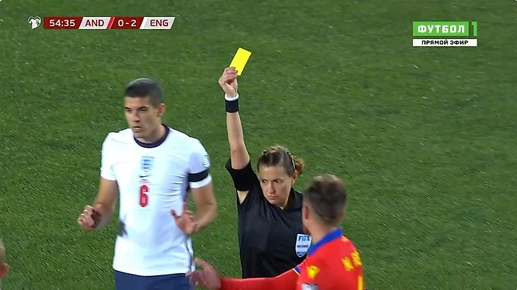 Чуть позже Джейдон Санчо зацепился с игроком сборной Андорры и откинул мяч, а потом демонстративно стал уходить от арбитра. И Монзуль наградила желтой и его.