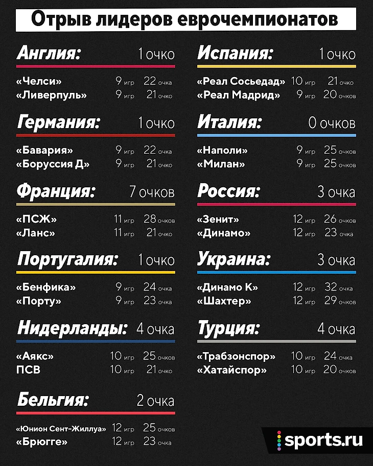 «ПСЖ» уехал на 7 очков, в АПЛ и Германии – разница всего 1. Какой отрыв у лидеров еврочемпионатов?