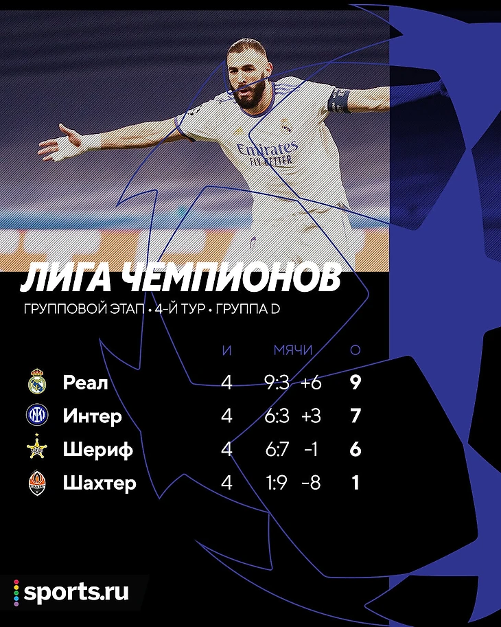 • «Реал» закрепился на первом месте в группе: теперь уже не делит с «Шерифом», а идет впереди на два очка благодаря победе над «Шахтером» (выиграли по-королевски шикарным голом). Победы в Тирасполе в следующем туре будет достаточно для выхода в плей-офф.
