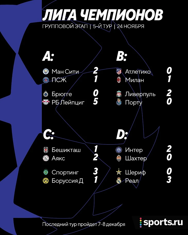 Вместе с победой «Милана» над «Атлетико» (1:0) это создало максимальную интригу на последний тур: «Порту» второй с пятью очками и принимает мадридцев, у «Милана» и «Атлетико» по 4 очка – и итальянцы ждут на «Сан-Сиро» немотивированный «Ливерпуль».