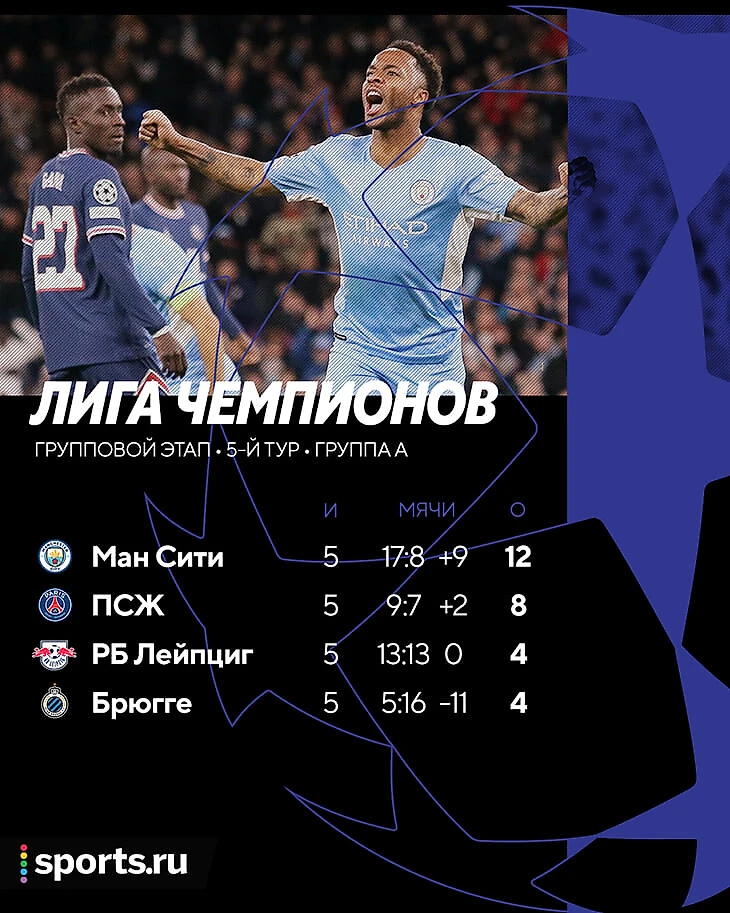 «Манчестер Сити» и «ПСЖ» гарантировали себе плей-офф. Помог «РБ Лейпциг», разбомбивший в гостях «Брюгге» со счетом 5:0. Команда Пепа благодаря победе над парижанами в пятом туре теперь железно первая.