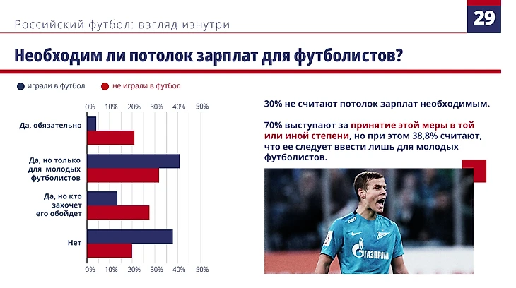 Почти 40% футбольных людей считает, что у российских игроков адекватные зарплаты