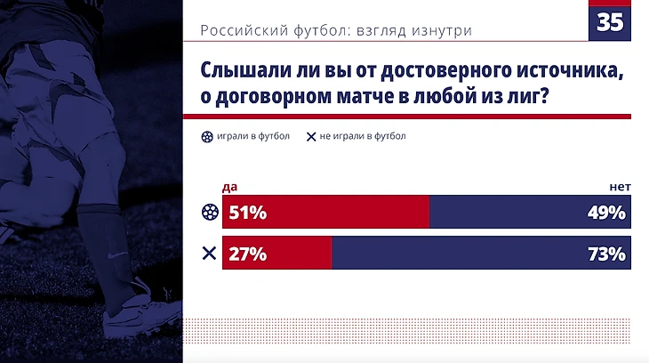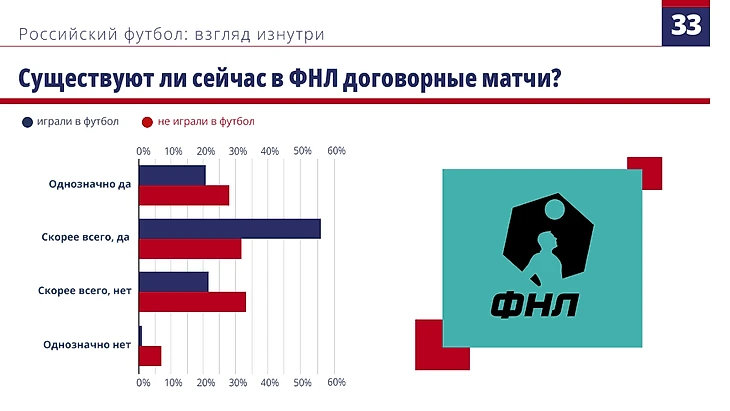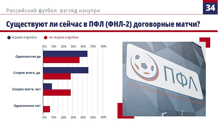 Более 30% футбольных людей предполагает, что договорняки остались в РПЛ, а 9,6% от общего числа опрошенных уверены в этом. В ФНЛ все еще однозначнее