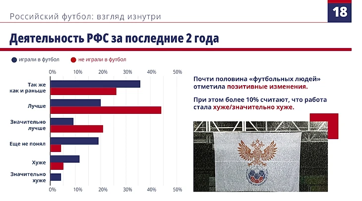 Мнение большинства респондентов с футбольным прошлым или настоящим: РФС стоит на месте. А вот журналисты и функционеры уверены, что прогрессирует.