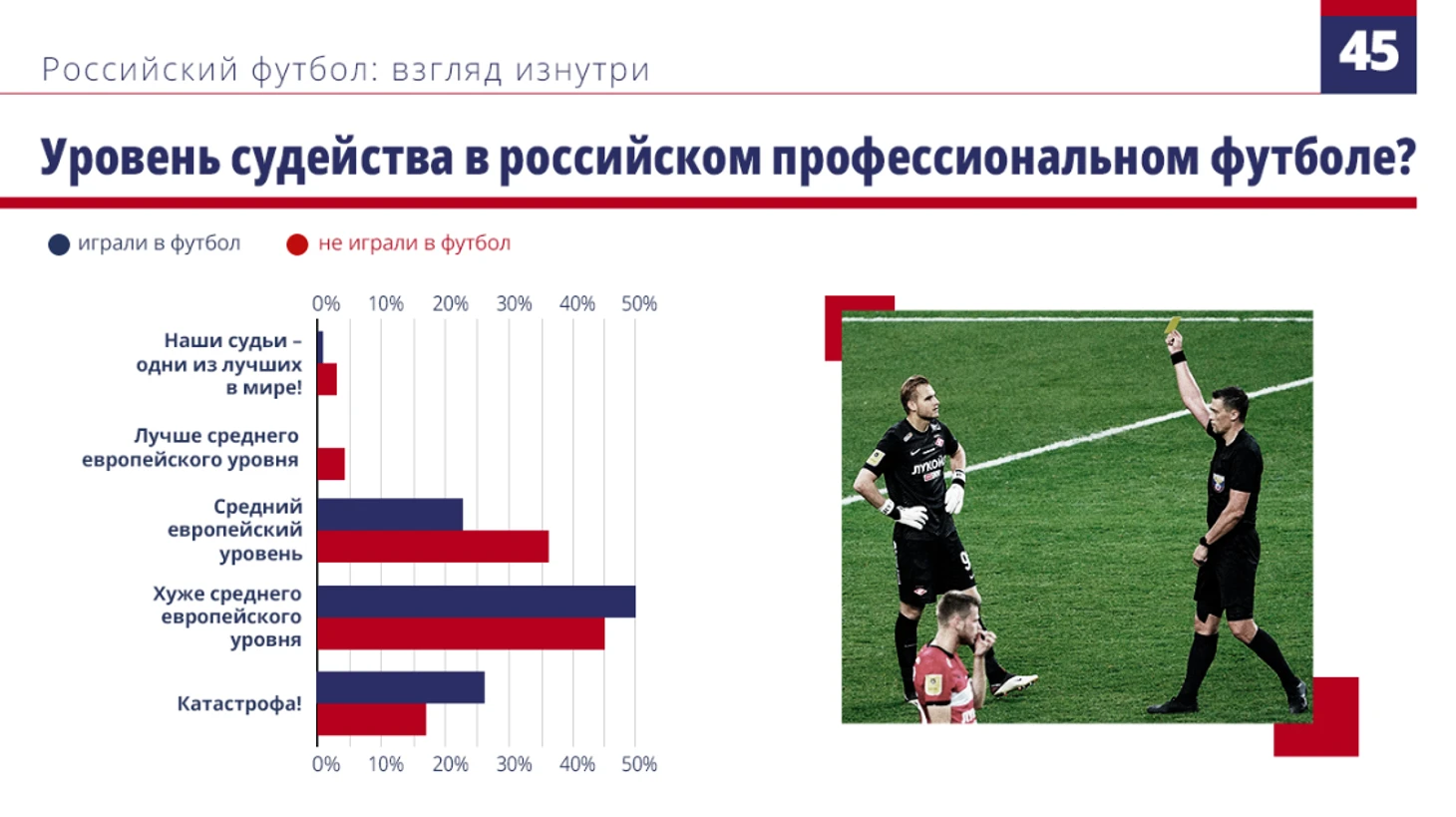 Для начала стандартный вопрос – куда движется наш футбол. Интересно, что люди с игровым опытом оценивают ситуацию гораздо хуже.